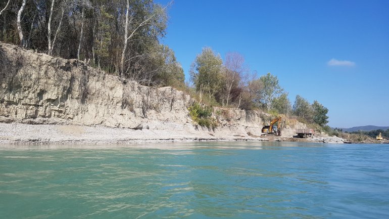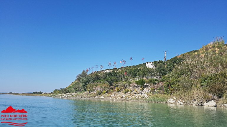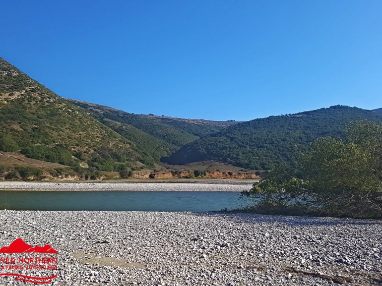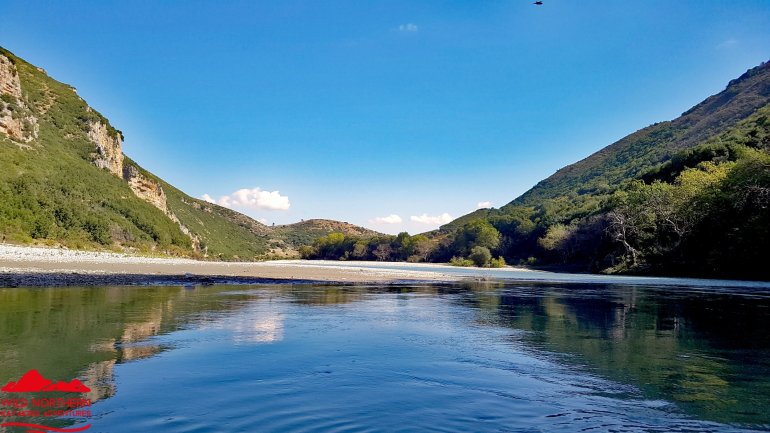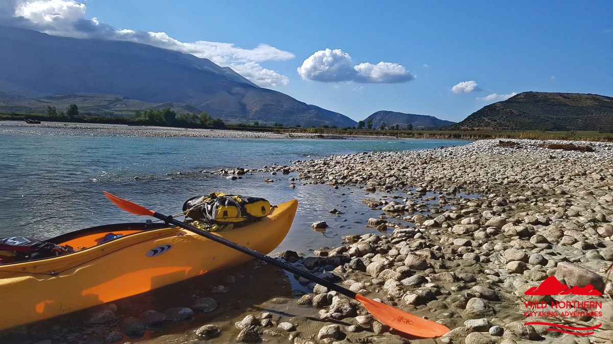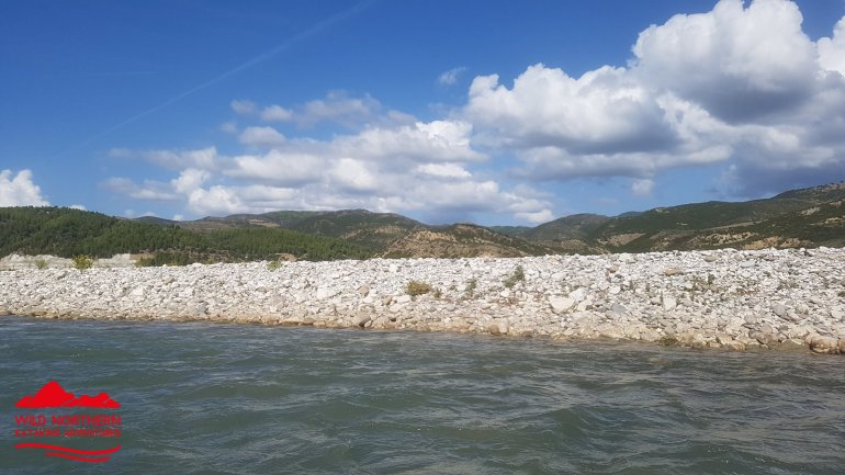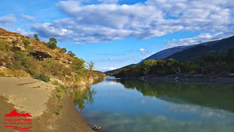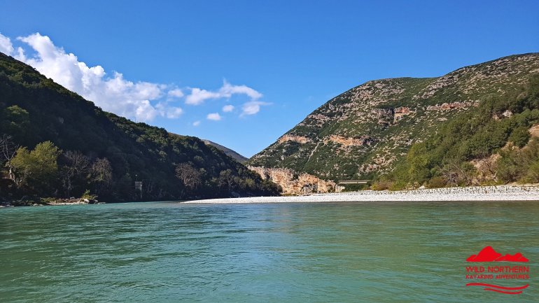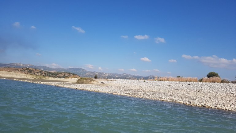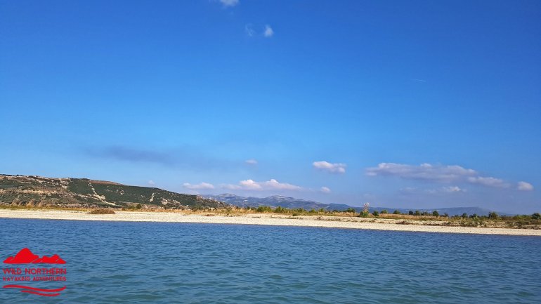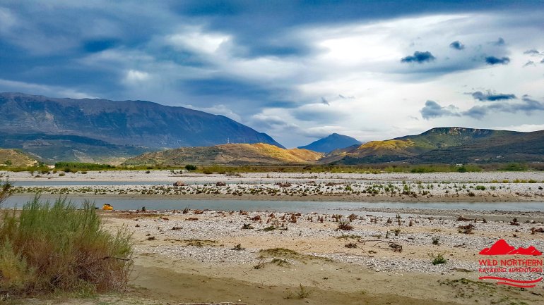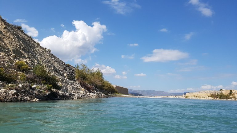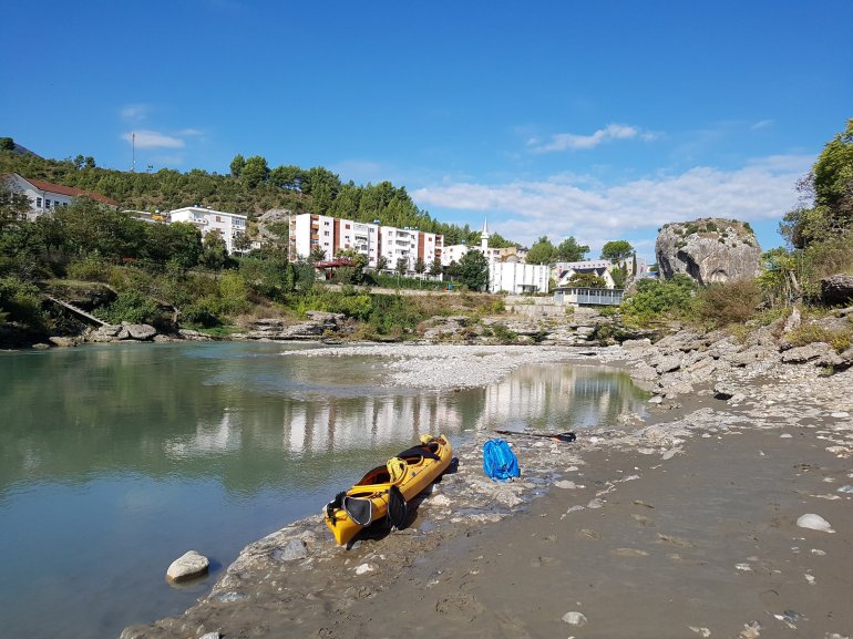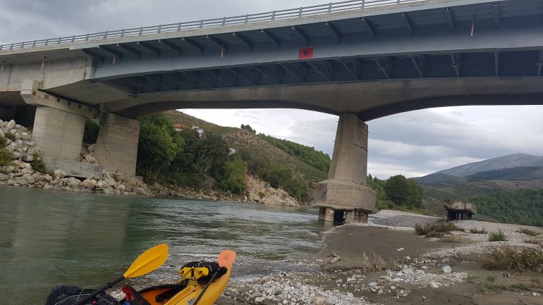 Die Vjosa sollte man als ungeübter Paddler auch nicht ab Permet befahren, da es mehrere knifflige Stellen mit WW 3-4 gibt. Ein Einstieg ab Tepelene, vor dem geplanten Staudamm (Achtung, kurz danach quert Stahlseil in Kopfhöhe das Wasser!!) ist jedoch ungefährlich.. Falls man etwas weiter oben (Permet) oder noch höher einsteigt, so empfehlen sich keine vollbeladenen langen Wanderkajaks.. Nach dem Staudammprojekt weitet sich das Tal der Vjosa auf und der Fluss verästelt sich. Da die Fliessgeschwindigkeit immernoch recht hoch ist, hat man das Problem, sich auf einen Ast festzulegen. Das führte bei uns zu häufigem Treideln, da man nie erahnt, wie flach diese Strecke wird. Allerdings hatten wir auch Niedrigwasser.. Auch die Luftbilder von google helfen recht wenig, da sich der Fluss fast jährlich total verändert.