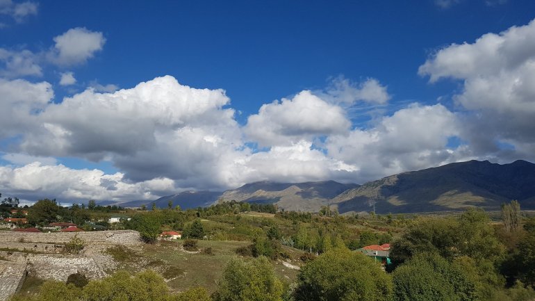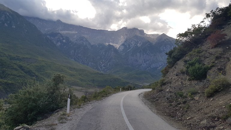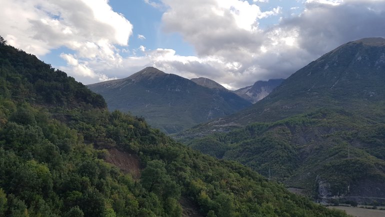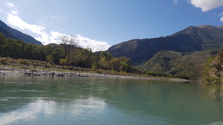 mit herrlicher Vjosa- Aussicht.Heute ist es bewölkt und etwas stürmisch. Wir fahren Richtung Tepelenë