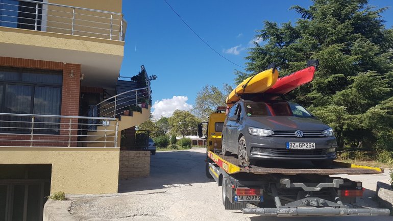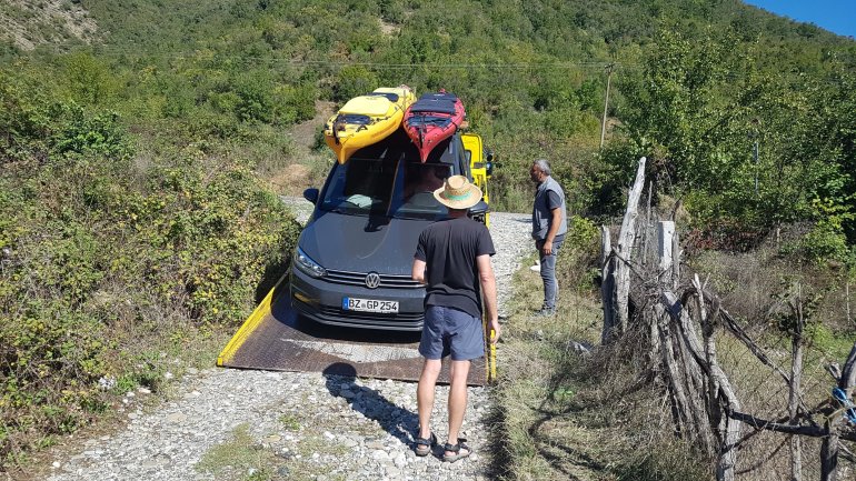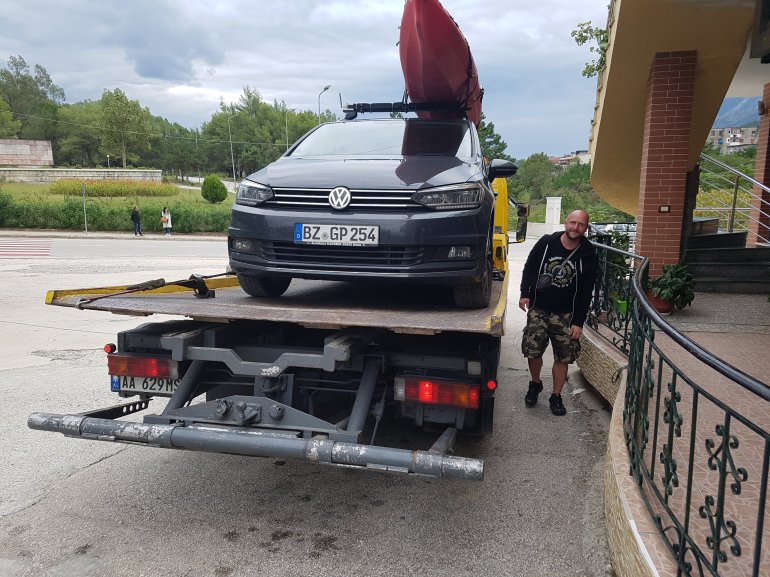 07.10.2019 Bereits 7.00 Uhr versuche ich mit dem örtlichen Autoclub die weitere Verfahrensweise abzuklären. Sie verweisen auf den ADAC. Wenn der grünes Licht gibt, wird das Auto dann nach Tirana zur Reparatur gehen und wir werden die Vjosa paddeln und hoffentlich später in Tirana ein repariertes Auto vorfinden..Doch das dauert alles…..So, das Auto ist weg, einschließlich Micha, der aus dringenden privaten Gründen uns auch verlassen musste..