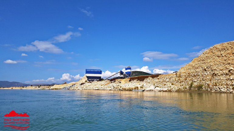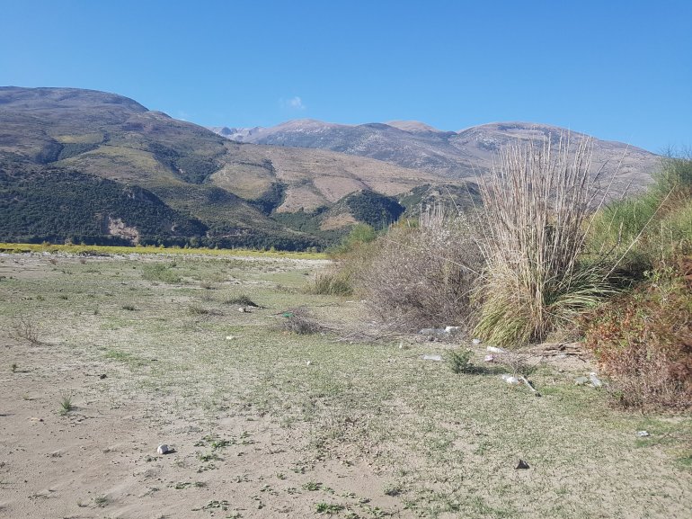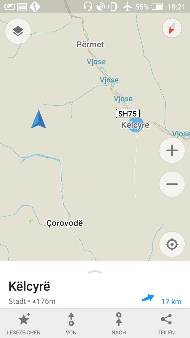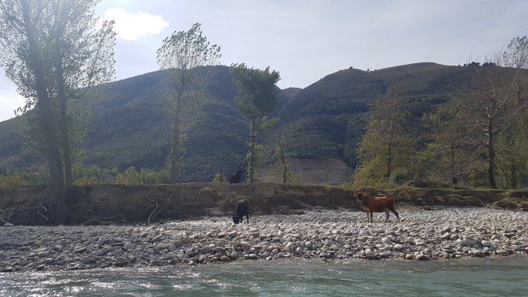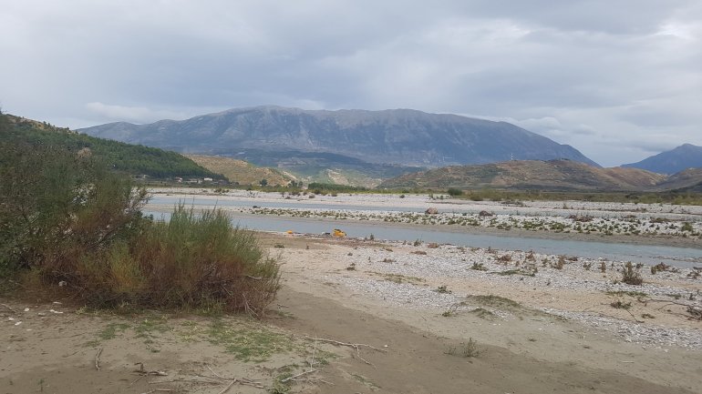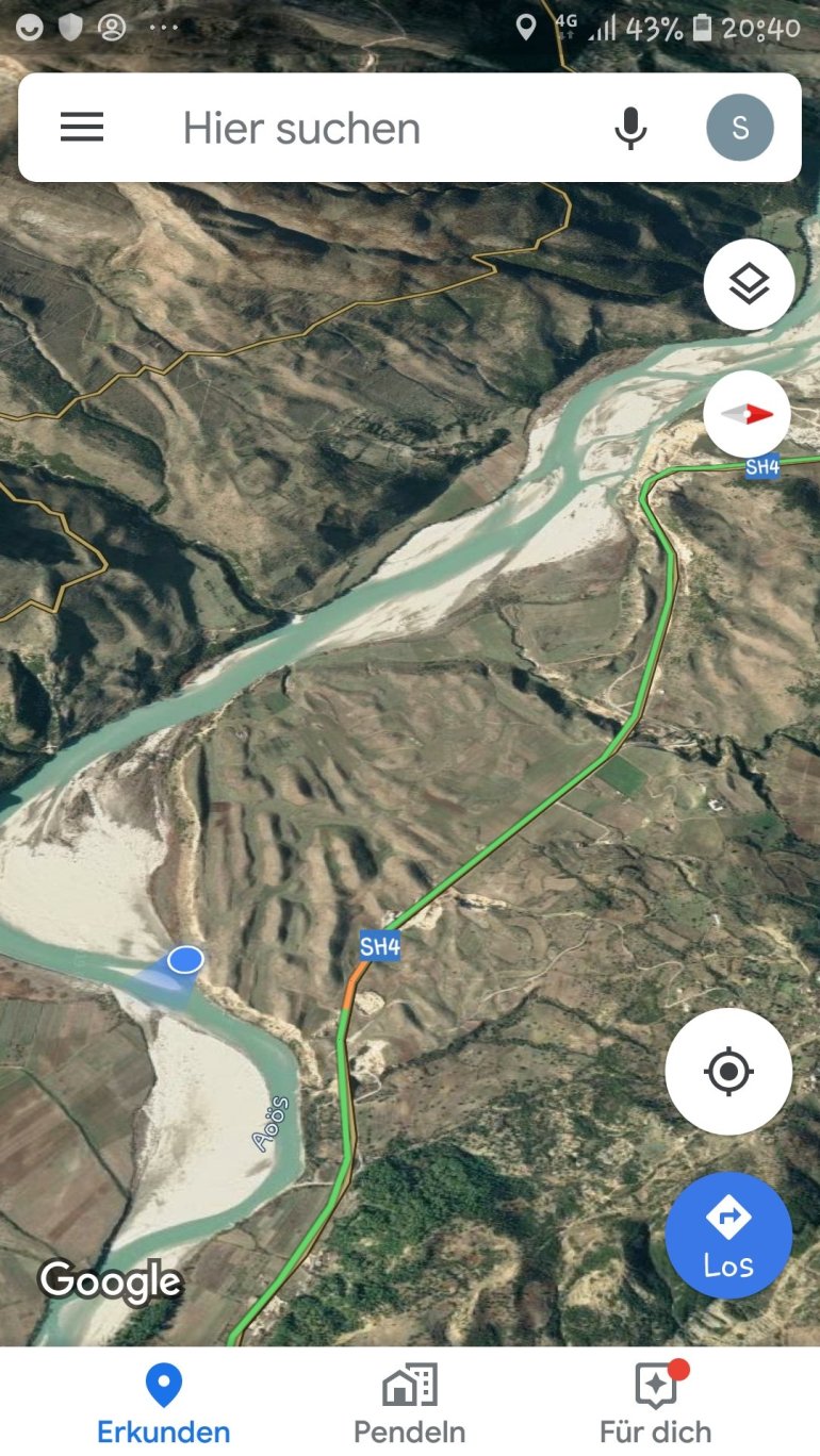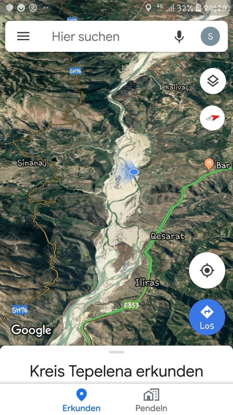 Wir fahren heute bis kurz vor die Schlucht vor Kalivac. Hier soll bereits seit 2000 ein Staudamm entstehen, der zum Glück derzeit gestoppt wurde. Die ganze Ebene, in der sich die Vjosa so aufästelt soll demnach angestaut werden. 2 Kuhhirten erzählen uns an unserem Nachtlager, dass dann hier alles über 30 m unter Wasser steht. Eine Katastrophe wäre das, den einzigen unverbauten Fluss Europas so zu strangulieren.Hier seht ihr, was ungefähr geflutet werden soll ( der blaue Punkt ist unser Camp)