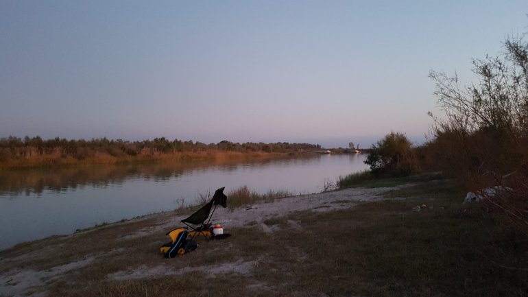 Unterwegs sehen wir noch schöne Campmöglichkeiten. Die Vjosa ist jetzt richtig breit und hat kaum noch Strömung.Links und recht stehen eigenartige Konstruktionen..Es sind riesige Senknetze zum Fischen. Manchmal wird das Hebendes Netzes mit einem Traktor angetrieben.Klassische Angler gibt es auch, jedoch weniger..