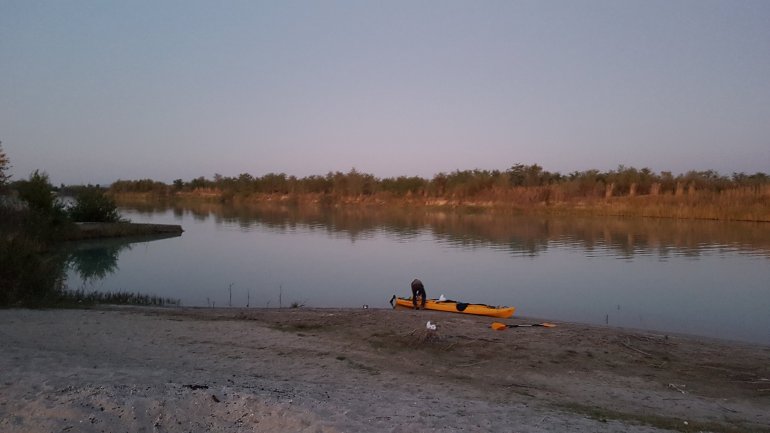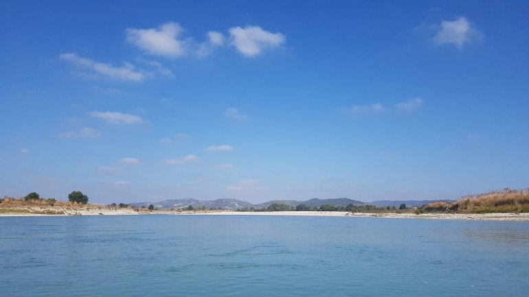 Die Vjosa weitet sich auf und besitzt kaum noch Strömung..Die Kiesbänke gehen in Sand über. Es ist nicht einfach, eine schöne Campstelle zu finden, da das Ufer fast vollständig bewachsen ist.