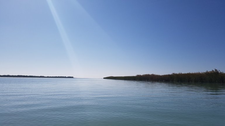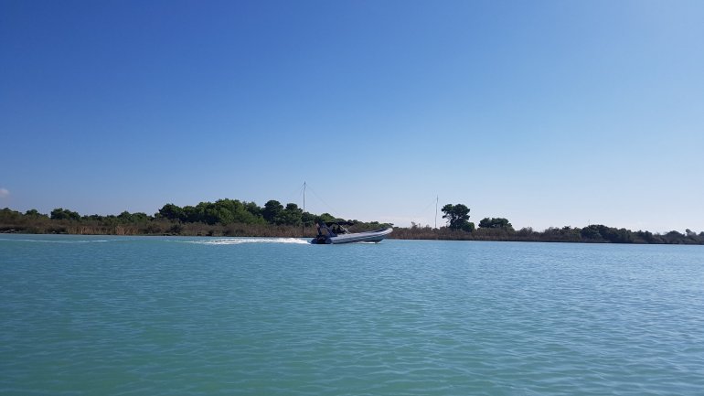 Eine Polizeipatroulie grüßt uns freundlich vom Boot, dem einzigen motorbetriebenen, das wir auf der ganzen Strecke sehen. Dann erreichen wir den Mündungsbereich und die Adria eröffnet sich uns..