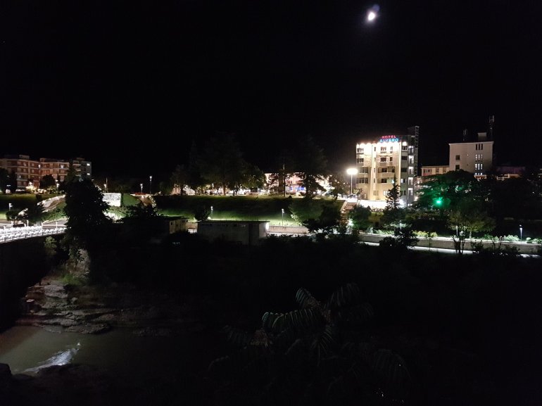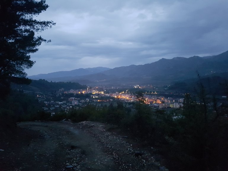 und ein abendlicher Blick auf ein etwas verregnetes Përemet. 08.10.Gegen 11.30 Uhr nahmen wir Abschied vom Hotel. Vorher musste ich wieder mit dem Autoclub Albanien debattieren..,da sie das Auto zur falschen Werkstatt schafften. Nun steht es bei Volkswagen Tirana, können es aber erst morgen ansehen..Start..