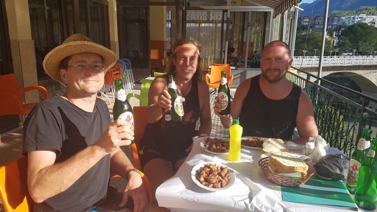 Das Bier ist hier für die Einheimischen mit ca. 0,65-1,00 EUR fast nicht bezahlbar und schmeckt gut. In der Kneipe kostet es 150-200 LEK, also 1,20-1,50 EUR. Dort trinken alle selbstgebrannten Schnaps (Raki). Der ist manchmal, wie in Permet so hervorragend, dass wir ihn uns für ca. 6-8 EUR in die Flasche füllen liessen. Je näher wir der Mittelmeerküste kamen, umso schlechter wurde der Brand.